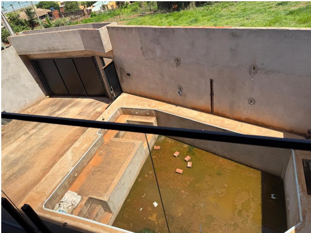 3 quartos (2 suites), 2 banheiros, garagem para 2 carros, lavanderia, quintal, piscina, copa, cozinha, 3 salas, jardim, churrasqueira